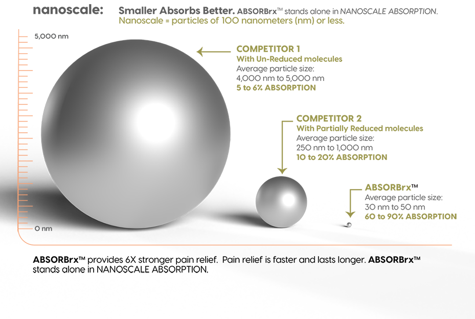 It Just Makes Sense. Very small particles absorb much better than far larger particles. The average particle sizes of our creams are deep into the nanoscale. We have certified independent lab analysis proof. No other leading HEMP pain brand can claim this.